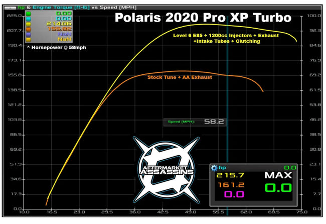 Level 4 - Beast mode - 200 RWHP! This tune is designed for 98-100 octane (will run on UTV 96, or most fuels up to 110 octane) and was developed using one can of VP Octanium to a tank of fuel. Mixing other race fuel with the tune to get 100 octane output would work great, just keep in mind consistently using leaded fuels can result in premature failure of O2 sensors. Now for the fun part.... this tune is INSANE and brings your Pro XP to a new level at 197-200 RWHP on our dyno. This tune gains 40-43 RWHP and pushes the boost level to 23-24 PSI peak before settling at 22-23 PSI. Keep in mind the Power Vision boost only reads to 22-23 PSI (depending on your altitude) so it will be close to maxing out the gauge. The ECU still has vision above that, but you won't be able to read it without a manual gauge. Required Mods: High flow pre airbox intake tube, exhaust, Charge Tube, Billet BOV, S3 Clutch Kit. Suggested mod: After airbox intake tube WITH catch can, torque head bolts tighter with 120 degrees more rotation. No wastegate adjustment required.